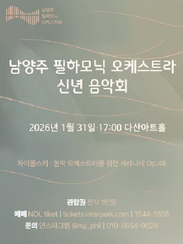 일정 검색 유형선택 전체보기 전체보기 날짜 : 검색하기 이전월 2026년 1월 다음월 공연일정 일정 달력(2026년 1월) : 일, 월, 화, 수, 목, 금, 토요일의 일정 SUN MON TUE WED THU FRI SAT 1 2 3 4 5 6 7 8 9 10 11 12 13 14 15 16 17 18 19 20 21 22 23 24 25 26 27 28 29 30 31 2026년 1월 문화일정 [남양주 필하모닉 오케스트라 2026 신년음악회] (다산아트홀) 장소 : 다산아트홀 기간 : 26-01-31 관람등급 : 초등학생 이상 2026 다산아트홀 기획공연 신년음악회 장소 : 다산아트홀 기간 : 26-01-23 관람등급 : 초등학생 이상