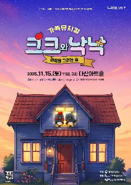 [가족 뮤지컬] 크크와 낙낙 ★ 노쇼 시 향후 다산아트홀 기획공연 예매가 불가합니다. * 티켓 예매 오픈 일시: 10월 30일(목) 오후 3시 · 예매는 공연 1시간 전, 취소 및 변경은 공연 1일 전 오후 5시까지 가능합니다. * 본 공연은 1인 5매까지 예매 가능합니다. * 포인트를 사용하여 티켓을 구매할 시 부분 취소가 불가하오니 유의하여 주시기 바랍니다. * 공연장 주변이 혼잡하여 공연 시간보다 일찍 공연장에 도착해 주시기 바랍니다. · 공연일정: 11월 15일(토) 오전 11시 / 오후 3시 · 러닝타임: 60분 · 관람연령: 36개월 이상 관람가능 (생년월일 증빙자료 지참 필수)